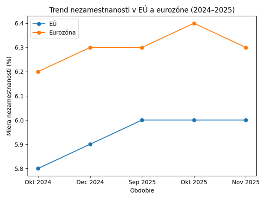 Napriek miernym výkyvom v jednotlivých mesiacoch sa miera nezamestnanosti v EÚ aj v eurozóne udržala na úrovniach, ktoré síce nenaznačujú dramatické zhoršenie situácie, no zároveň poukazujú na pretrvávajúce výzvy v oblasti zamestnanosti. Podľa Štatistiky nezamestnanosti na portáli Eurostatu dosiahla miera nezamestnanosti v eurozóne v novembri 2025 približne 6,3 %, čo predstavovalo mierny pokles oproti predchádzajúcemu mesiacu. V celej EÚ sa miera nezamestnanosti pohybovala okolo úrovne 6,0 %. V medziročnom porovnaní však ide len o mierny nárast, keďže v roku 2024 boli hodnoty o niekoľko desatín percent nižšie, podľa mesačnej štatistiky Eurostat medzi rokmi 2024 až 2025.