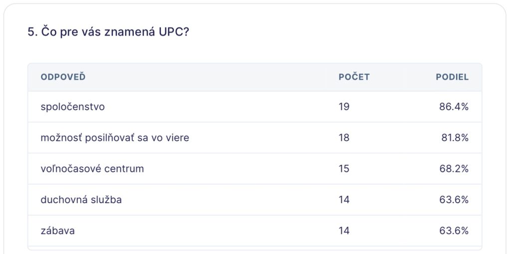 Piata otázka má pre každého úplne iný význam, pretože som v nej zisťovala aký má význam UpaC pre našich študentov. Niekto tam chodí, aby prišiel na iné myšlienky, aby sa možno trochu odreagoval od učenia, no a niekto tam chodí aby sa čo najviac duchovne rozvíjal. Každý to má inak… Samozrejme je úplne prirodzené, ak tam chodíme z viacerých dôvodov a naše možnosti sa vzájomne dopĺňajú a prelínajú.  Zaujímavosť ktorú spomenul aj páter je, že UPaC nám hlavne pomáha rozvíjať vzťahy, či už tie s Bohom alebo s novými priateľmi, no a dokonca si tam môžeme nájsť aj nášho životného partnera.