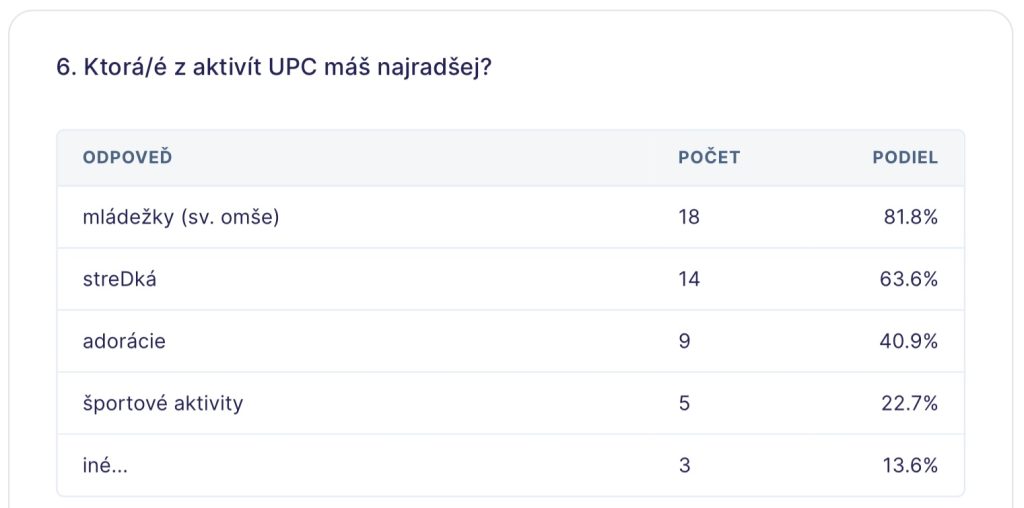 Najväčšou zaujímavosťou bolo pre mňa zistenie, že nie len v bratislavskom UPC, ale aj u nás je najobľúbenejšou aktivitou sv. omša. A to bolo obsahom šiestej otázky: Ktorú z aktivít máš najradšej? No ako povedal páter, určite to bude preto, lebo mládežka sa koná v takom čase, kedy už máme od školy ,,pokoj“ a môžeme sa venovať aj  voľnočasovým aktivitám.