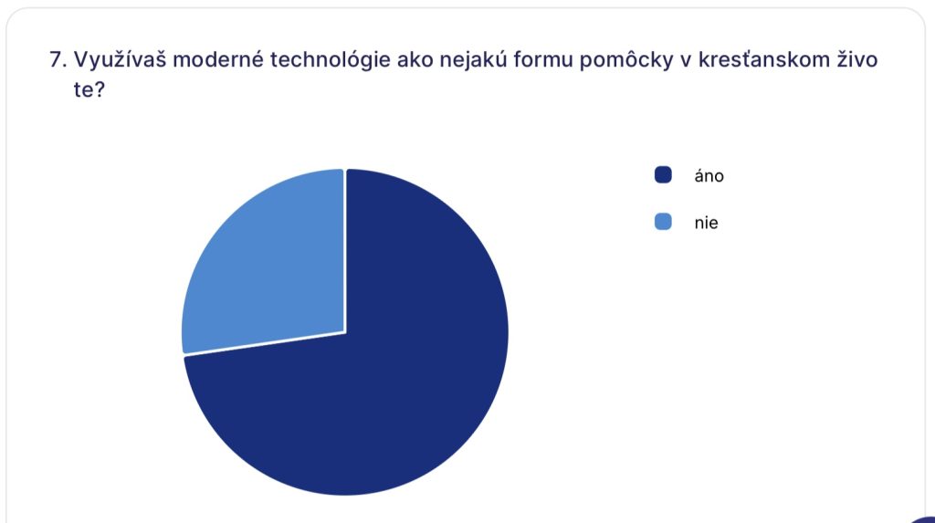 Posledná otázka sa pýtala, či využívame moderné technológie ako pomôcku v kresťanskom živote. Ja osobne používam často ,,moderné pomôcky” na evanjelizáciu. V dnešnej dobe často využívame aj rôzne aplikácie ako napríklad: Biblia, Modlitby a podobne. Je to určite super pomocníkom pre každého.