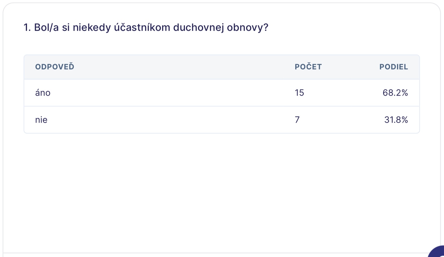 Prvou otázkou bolo, či sa niekedy zúčastnili na duchovnej obnove. Väčšina respondentov dala áno. Páter pri jeho prieskume spomínal, že najčastejší dôvod neúčasti boli zbytočné predsudky dopredu, vnútorný strach alebo nedostatok času.