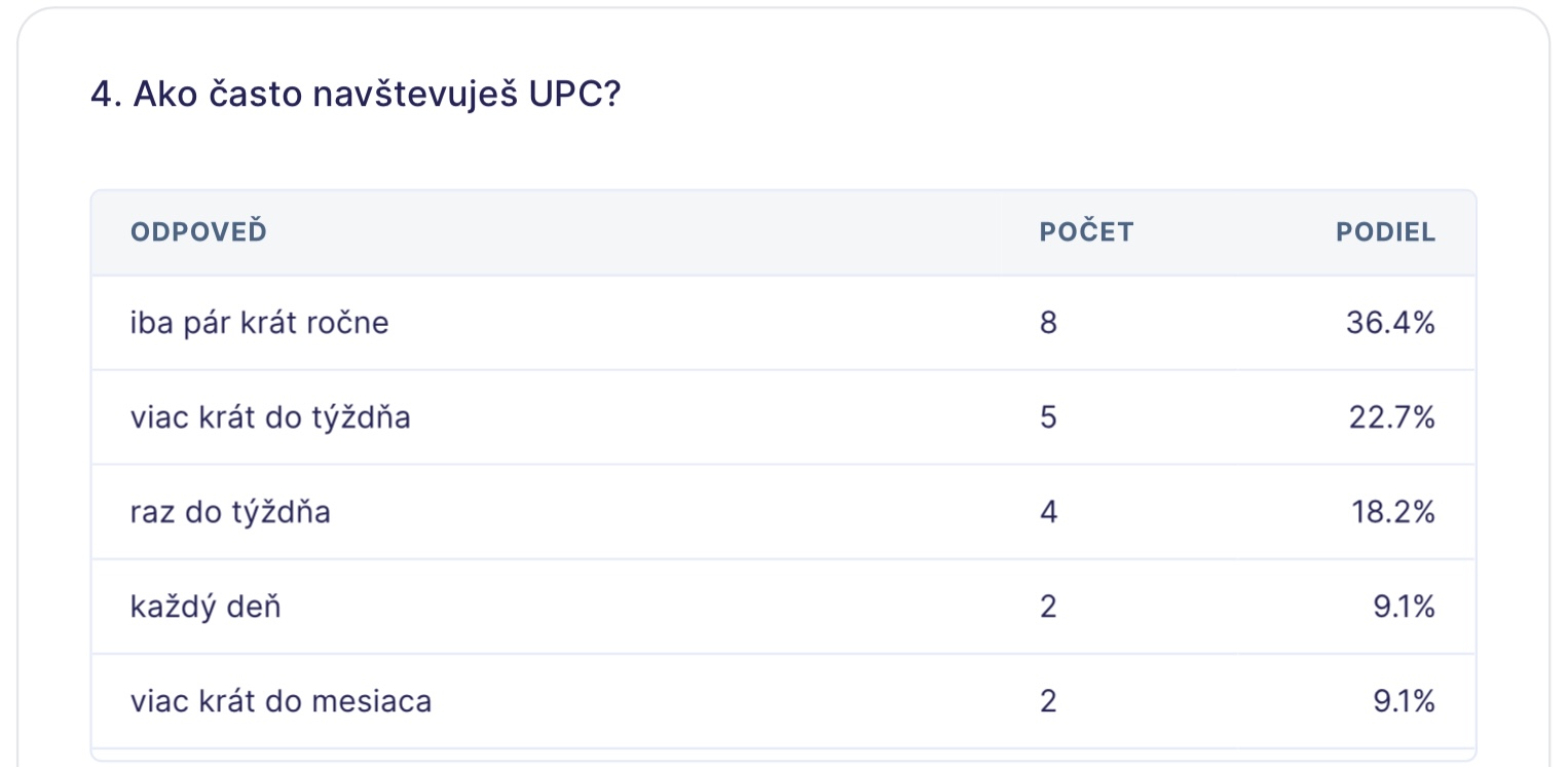 Štvrtá otázka sa týkala návštevnosti UPaC. Vo fotkách dole môžete vidieť, ako často naši členovia navštevujú a trávia čas v UPaC.
