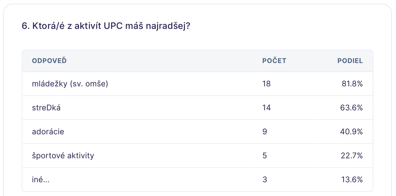 Najväčšou zaujímavosťou bolo pre mňa zistenie, že nie len v bratislavskom UPC, ale aj u nás je najobľúbenejšou aktivitou sv. omša. A to bolo obsahom šiestej otázky: Ktorú z aktivít máš najradšej? No ako povedal páter, určite to bude preto, lebo mládežka sa koná v takom čase, kedy už máme od školy ,,pokoj“ a môžeme sa venovať aj  voľnočasovým aktivitám.